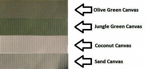Canvas colors include Sand, Olive, and Coconut and the option for customized colors with a minimum order. Frame colors vary depending on the type of metal frame you choose.