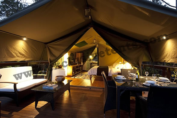 If you want to add space in the back of the tent for a bathroom, adding an extra 6 feet 6 inches (roughly 2m) to the back of your tent. The bathroom will have a screened roof for extra ventilation.